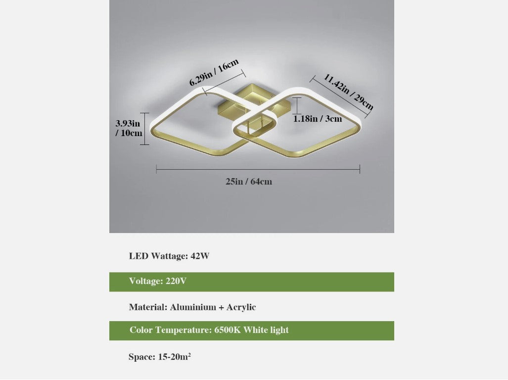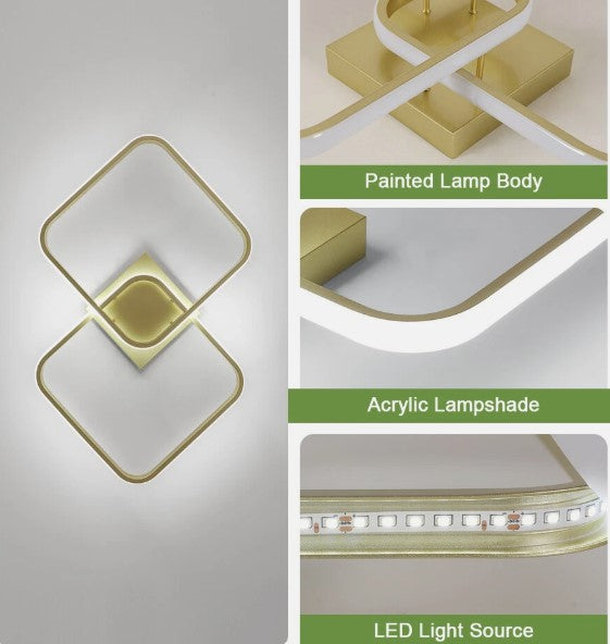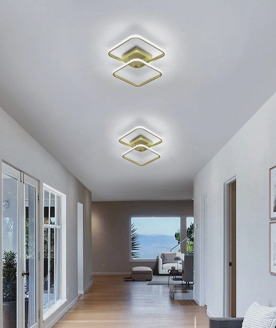 Crafted from premium aluminum and acrylic, this ceiling light features a sophisticated gold finish that adds a touch of elegance to any space. Its durable construction ensures excellent resistance to corrosion and wear. The integrated LED bulbs offer superior brightness while consuming significantly less energy than traditional bulbs. Equipped with high-quality LED chips and a frosted acrylic lampshade, this ceiling light delivers soft, flicker-free illumination that minimizes glare and reduces eye strain. It creates a cozy and comfortable lighting atmosphere while protecting your vision. Showcasing a clean geometric silhouette and a luxurious gold color, this ceiling light embodies minimalist style with a glamorous edge. Perfect for adding a refined and modern touch to your interior décor. Designed with a modern dual-frame LED structure, this ceiling light is ideal for hallways, bedrooms, living rooms, kitchens, balconies, and staircases. It combines functional illumination with eye-catching style.