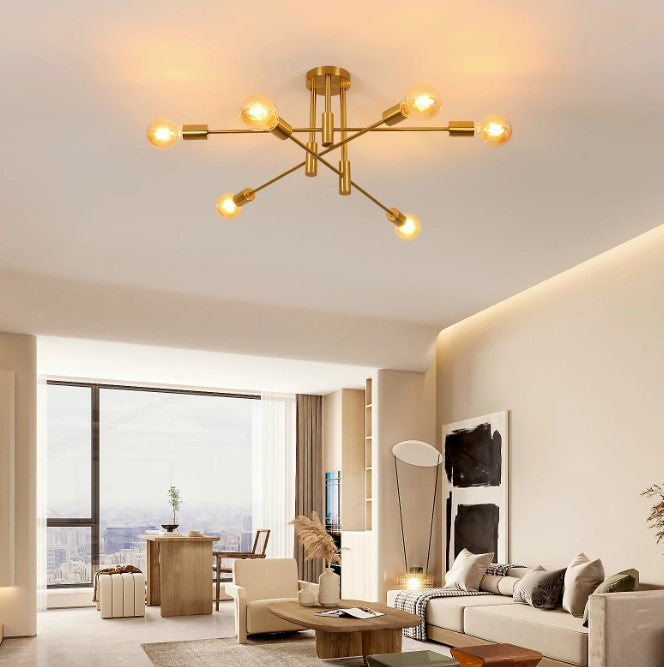 Add a touch of luxury and modern elegance to your interior with this Gold 6-Light Adjustable Chandelier. Crafted with advanced plating technology, the chandelier features a sleek electroplated gold finish that exudes sophistication. Its unique 6-light design offers directional illumination, making it both a functional and eye-catching centerpiece. The rotatable arms can be adjusted before installation to suit the layout of your space, allowing for maximum customization. Made from durable iron with a stable, short-circuit-protected driver, this fixture combines beauty with safety. Compatible with E27 bulbs (not included), it’s ideal for creating a cozy atmosphere in living rooms, bedrooms, dining areas, and commercial spaces like cafés or bars.