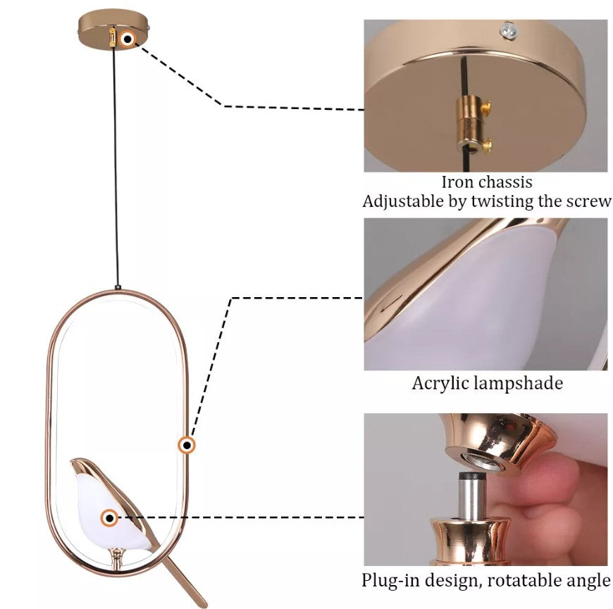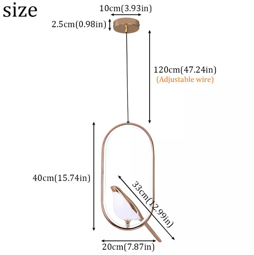 This decorative ceiling light is made of high-quality acrylic material, ensuring durability and an elegant appearance. The creative artistic bird design is realistic and lifelike, adding a unique visual charm to any space. The lamp is ceiling-mounted and suitable for bedrooms, living rooms, offices, nightstands, stairways, and more. It features a height-adjustable chain up to 120 cm, and the light body can be adjusted, allowing the bird’s direction to be set as desired.