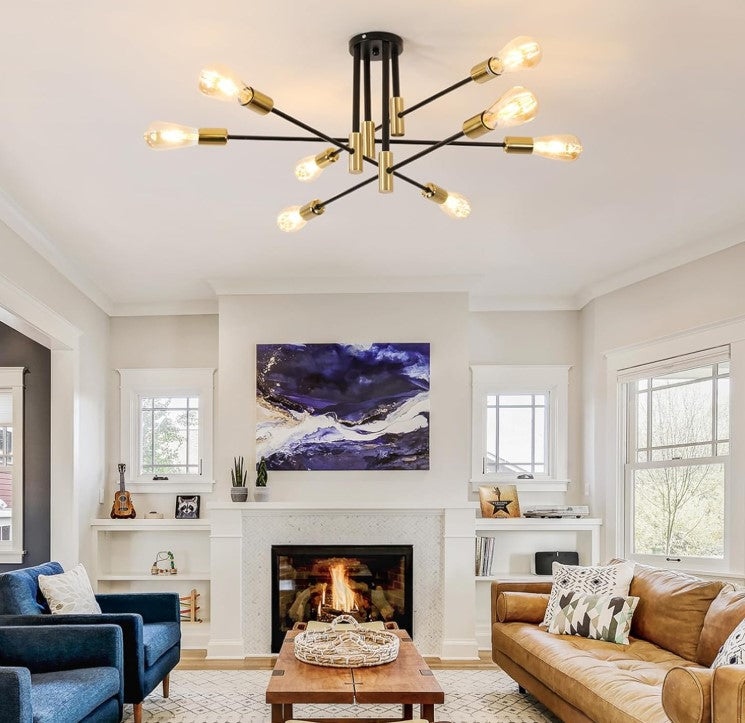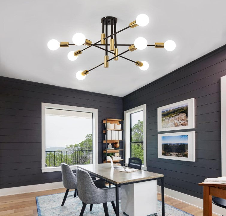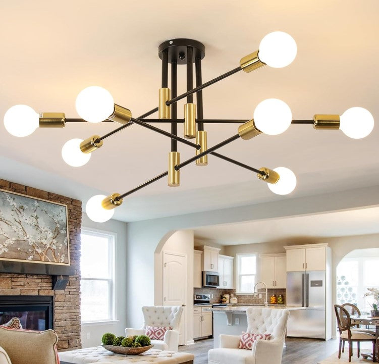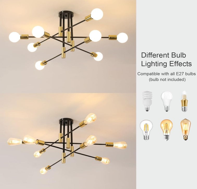 The sputnik ceiling lights made of high quality metal, high temperature iron baking lacquer body, black and golden rustproof coating. Stable performance, anti-oxidation, corrosion resistance, not easy to rust, durable. The arm of modern ceiling lights is adjustable, allows you to DIY it into your favourite shape when you install it. The black chandelier can be compatible with E27 LED bulb, halogen, incandescent, also fully dimmable when used with a dimmable bulb and a dimmer switch. (bulb/switch not included). Each bulbs Max. 60W. All 4 arms of this pendant light for bedroom are pre-wired and pre-threaded, with installation instructions and mounting accessories for easy assembly.