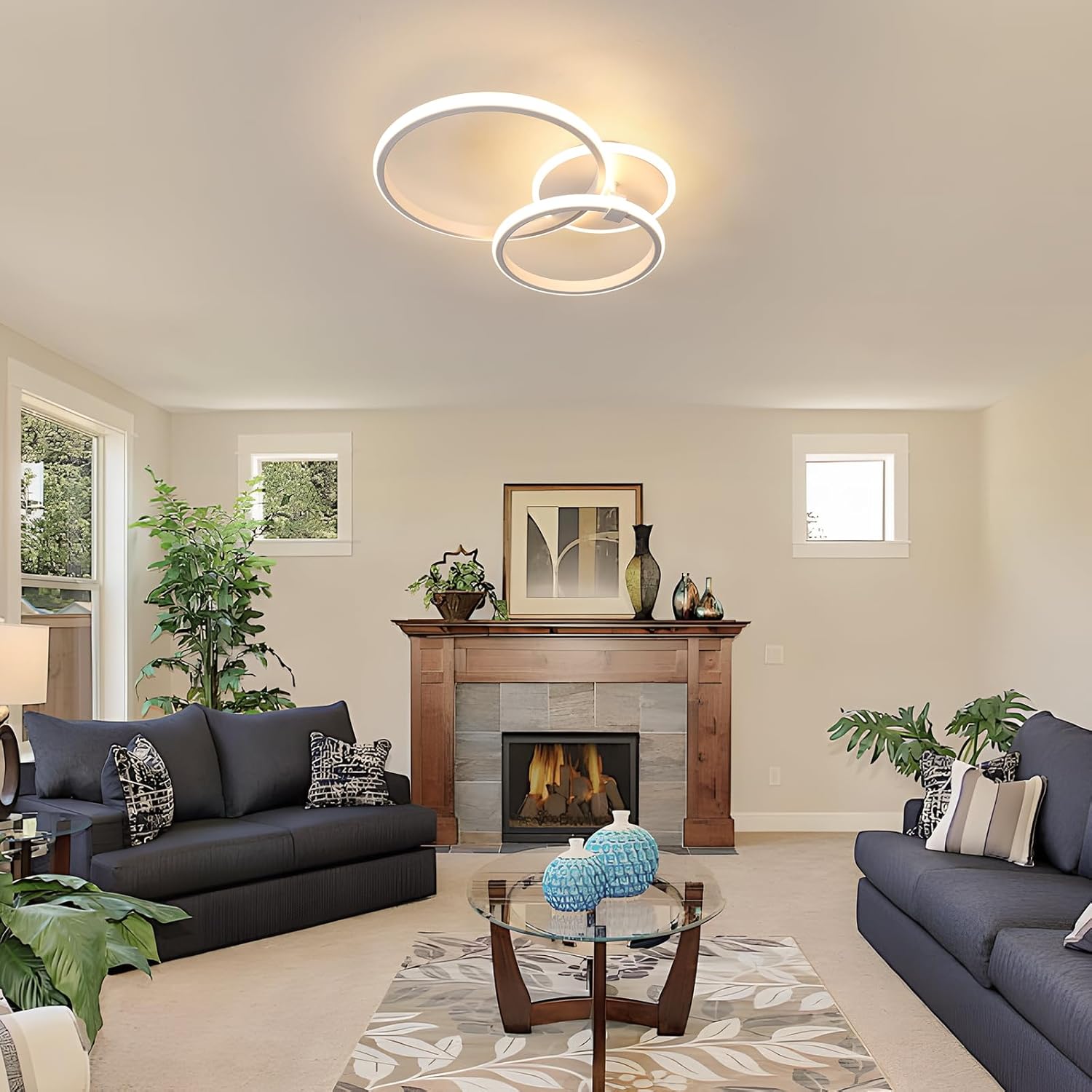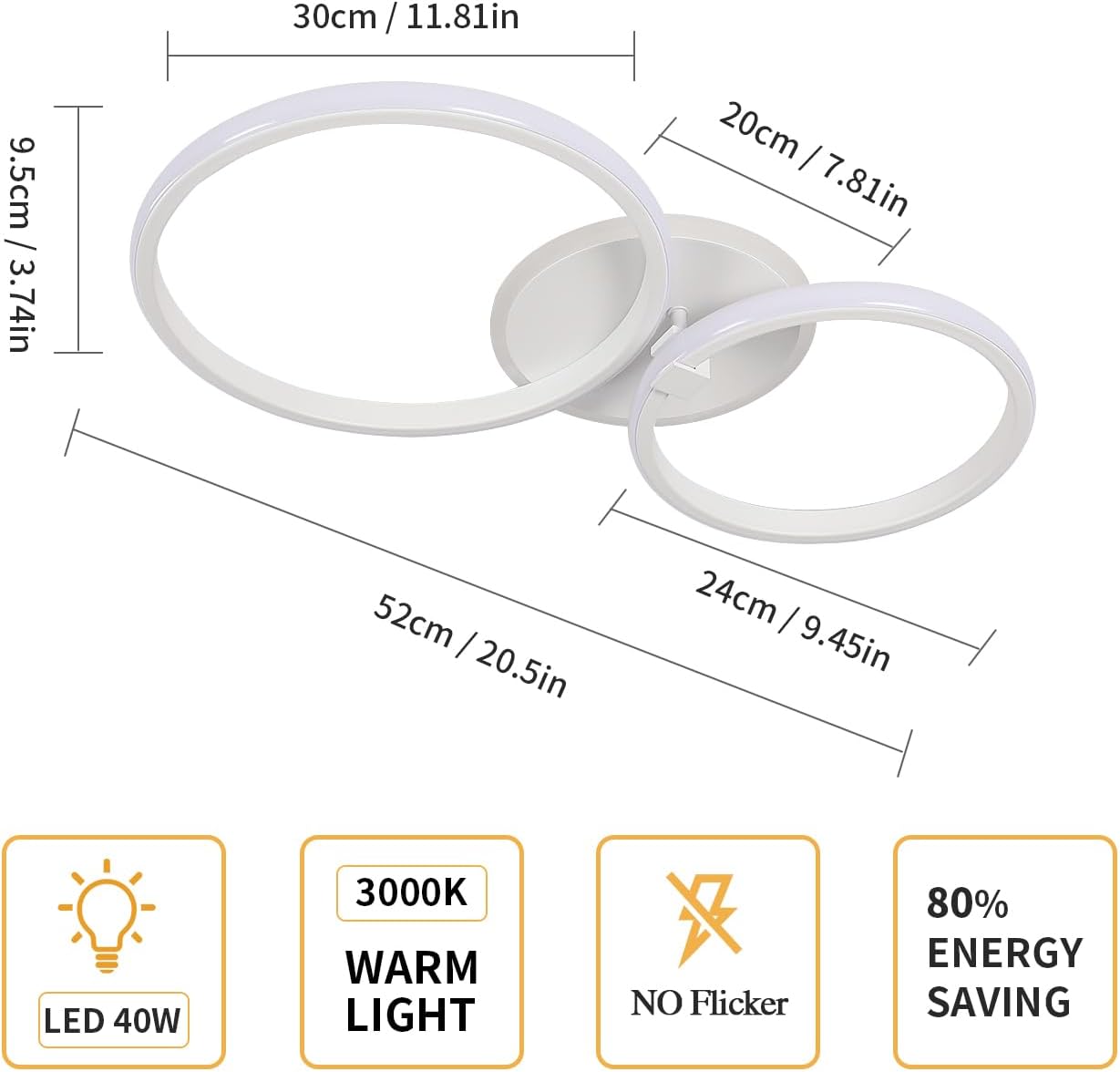 This white/gold ceiling light is designed with three overlapping circles, all of them shine. The frame is firm and the other two hollow circles can be turned inward and outwards for a wider range of lighting. The warm 3000K light makes the indoor lighting more comfortable and creates a warm and romantic living atmosphere. The living room chandelier is made of high quality aluminum and acrylic. The surface of the lamp body is treated with high temperature spray paint, anti-corrosion and anti-rust, reliable and durable. The acrylic lampshade has good light transmission, no glare, and also protects your eyes and your family eyes from irritation. This modern led ceiling light has a simple structure, and the light body internal wiring is already made. Two rings can be installed crosswise or in parallel. Package comes with all installation accessories and detailed instructions, quick and easy installation steps.