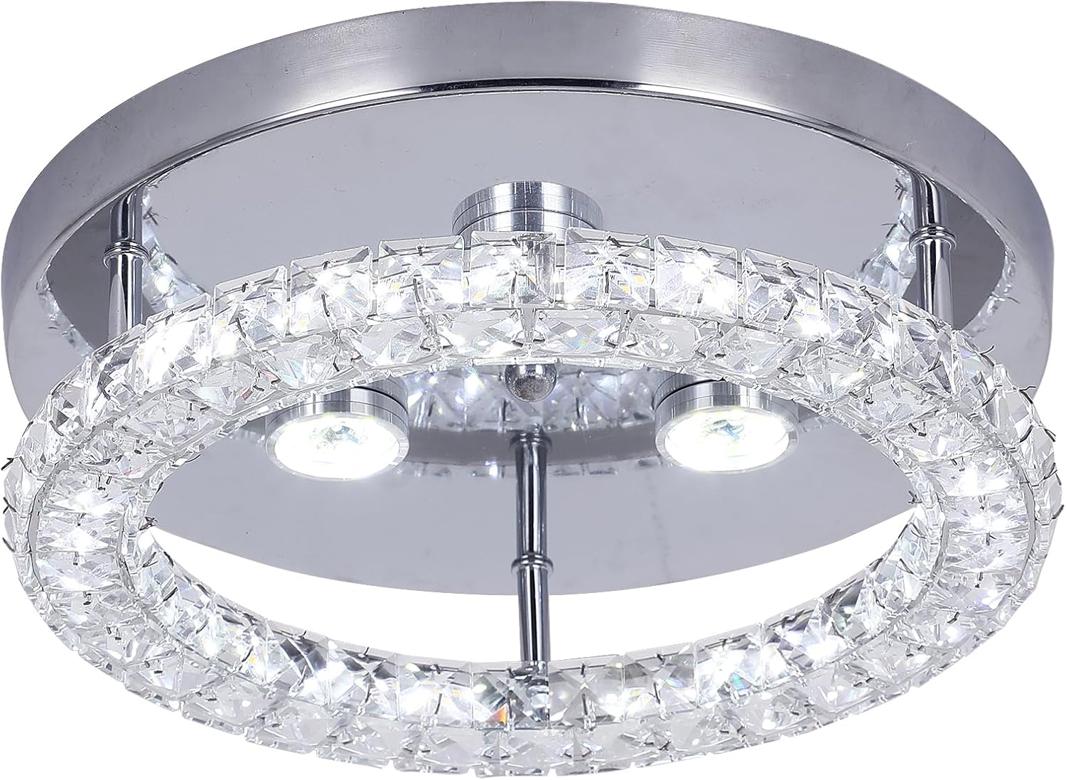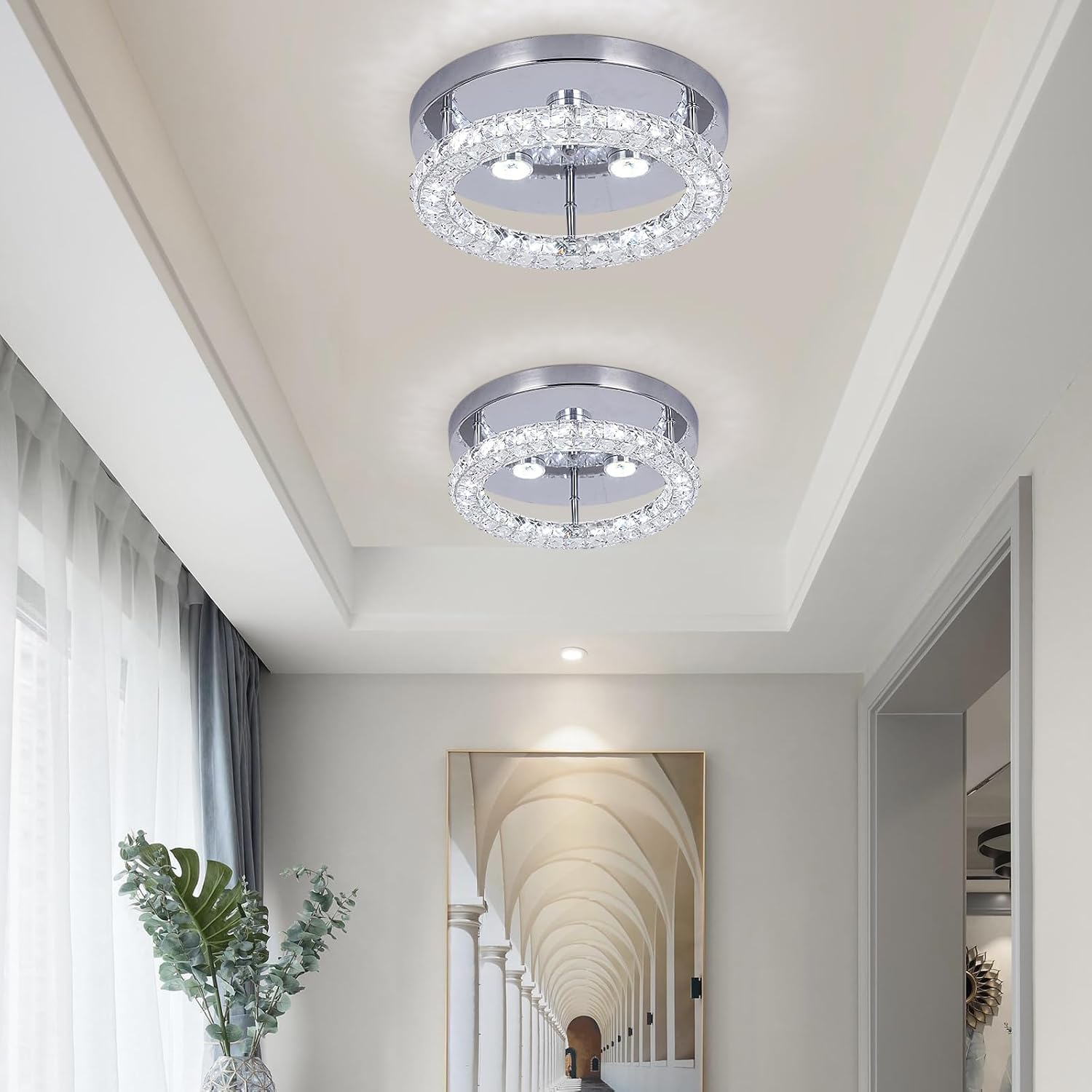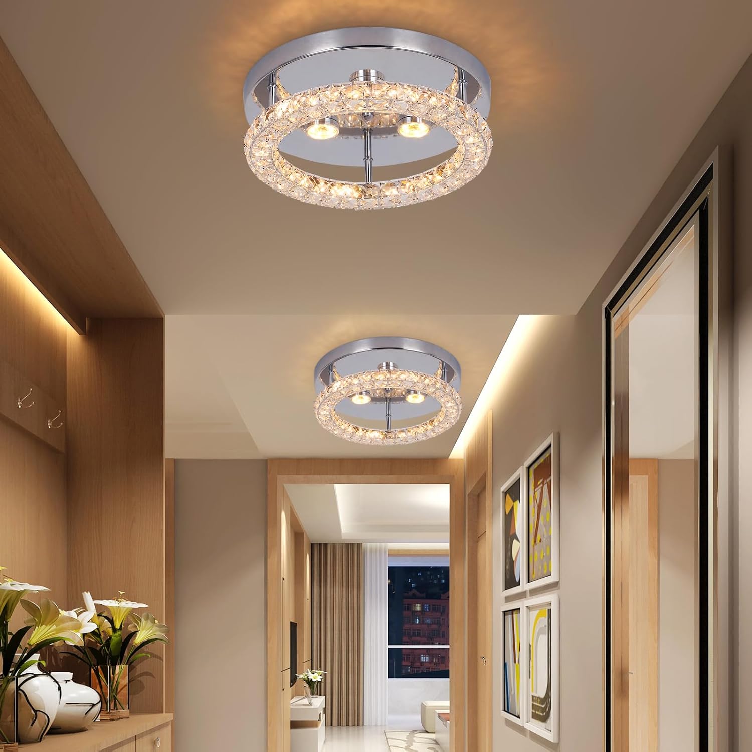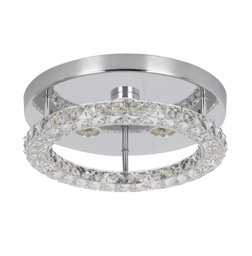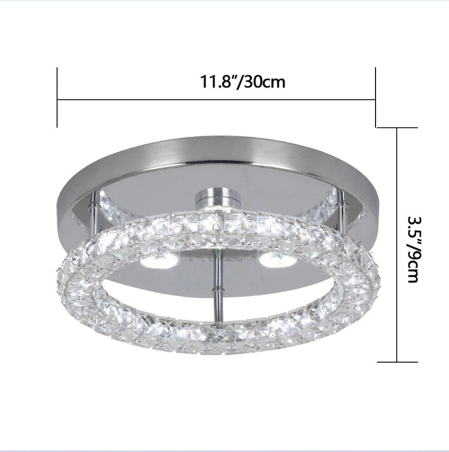 This modern round LED ceiling light features a sleek chrome finish combined with a sparkling crystal ring that enhances light reflection and adds a touch of luxury to any space. Designed with changeable light color, it allows you to switch between different lighting tones to suit your mood or activity. The flush-mount, hardwired design makes it ideal for rooms with low to standard ceiling heights, while the integrated LED technology ensures energy efficiency, long lifespan, and consistent performance. Perfect for contemporary interiors such as bedrooms, living rooms, hallways, and offices.