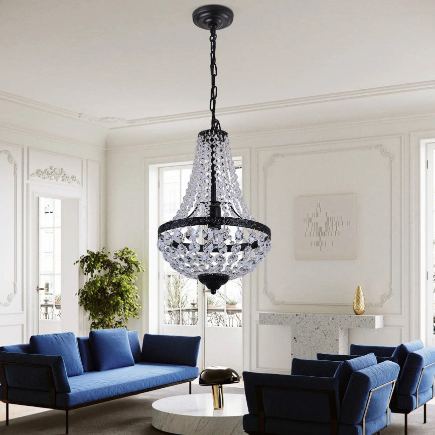 Elevate your interior with this elegant crystal pendant chandelier, designed to bring timeless sophistication and sparkling ambiance to any space. Featuring cascading clear crystals and a beautifully crafted metal frame, this chandelier creates a luxurious focal point while providing warm, inviting illumination. Available in Black or Gold finishes, it blends classic charm with versatile styling, making it ideal for living rooms, dining areas, bedrooms, hallways, or entryways.