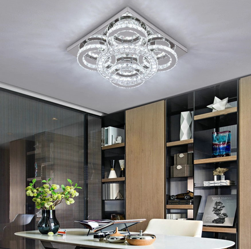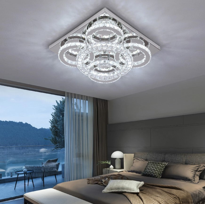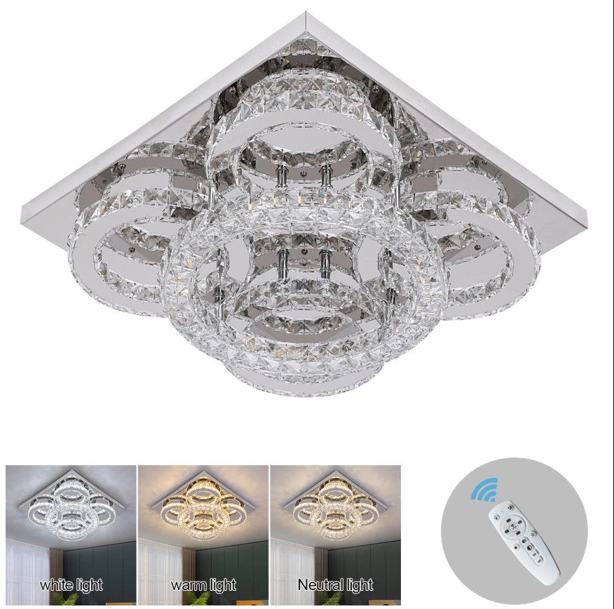 Upgrade your interior with this modern crystal LED ceiling light, designed to bring elegance and brilliance to any room. Featuring a unique geometric design with sparkling crystal elements, this ceiling fixture delivers both style and functionality. The built-in LED light offers three adjustable color temperatures—warm, neutral, and cold white—which can be easily controlled using either the remote control or a standard wall switch. Perfect for living rooms, bedrooms, dining areas, or hallways, this ceiling light combines contemporary aesthetics with energy-efficient performance and everyday convenience.