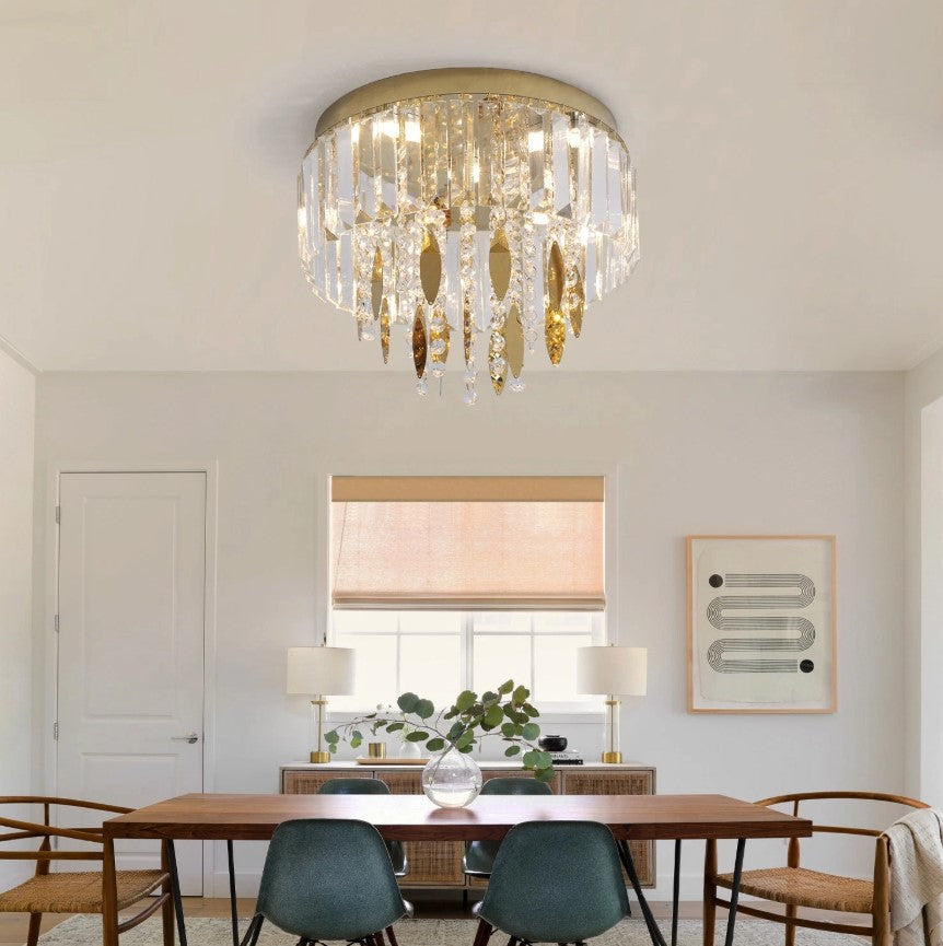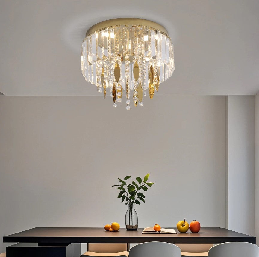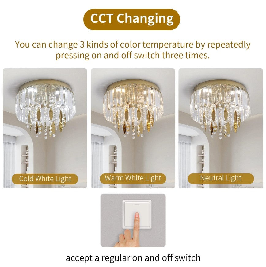 This elegant ceiling light is crafted from high-quality crystal and stainless steel, combining modern luxury with timeless design. The layered crystal elements create a stunning visual effect while delivering soft, evenly distributed illumination. Featuring three adjustable light colors, this fixture allows you to easily change the ambiance of your space using a standard wall switch. It is ideal for living rooms, bedrooms, hallways, and other interior spaces where style and functionality are equally important.