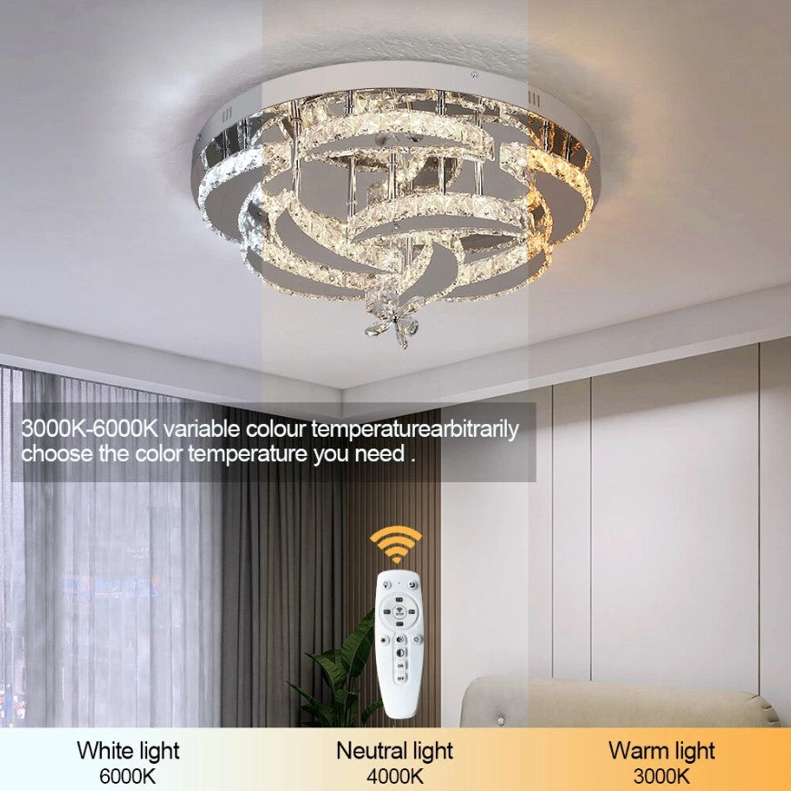 This modern crystal ceiling light features a stylish design and practical functionality, making it a perfect addition to any contemporary interior. Equipped with three color lighting modes, it allows you to switch between warm, neutral, and cool light using a wall switch or remote control. The elegant crystal elements enhance brightness while adding a luxurious touch to living rooms, bedrooms, or dining areas.
