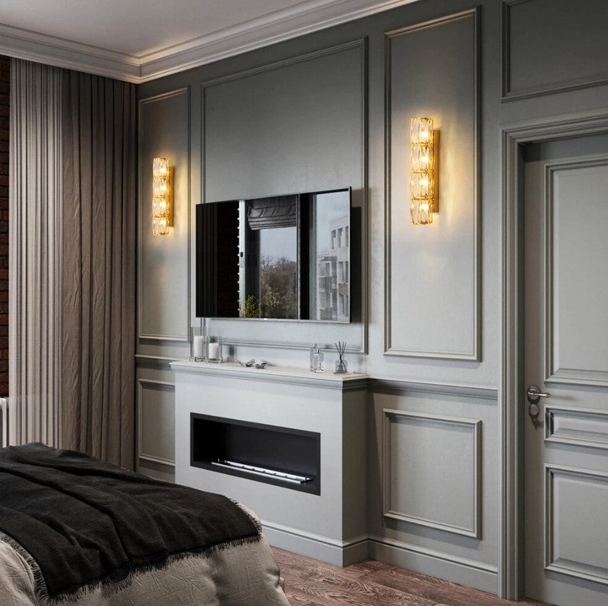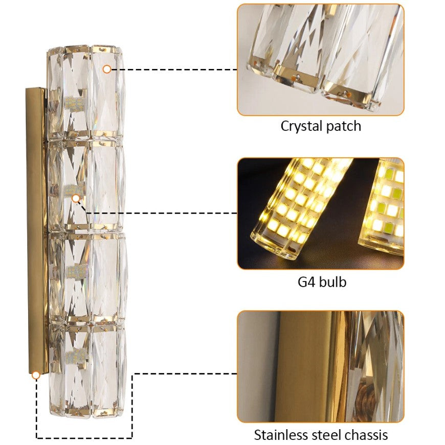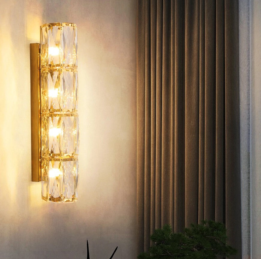 This modern crystal wall sconce combines elegant design with warm ambient lighting. Featuring a sleek gold metal frame and faceted crystal elements, it adds a touch of luxury to any interior. Designed to work with G4 bulbs, this wall light is ideal for living rooms, bedrooms, hallways, and hotel spaces, providing both style and functionality.