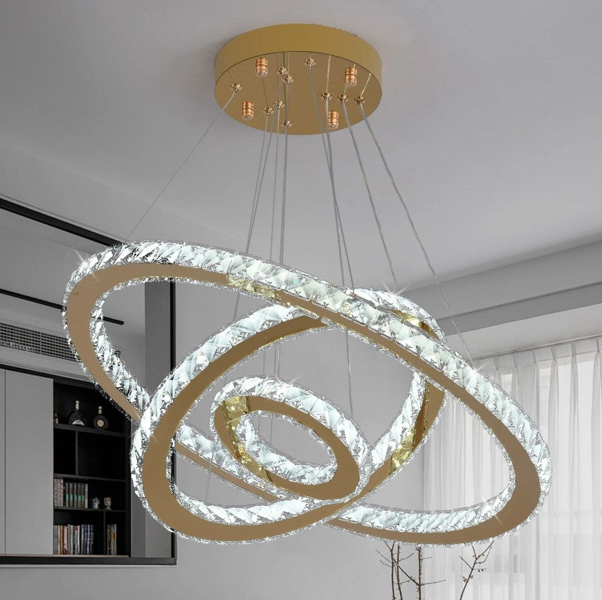 This modern crystal pendant chandelier features a striking 3 rings design crafted from high-quality stainless steel and premium crystal. The polished metal frame ensures durability and corrosion resistance, while the crystal elements provide excellent light refraction for a brilliant, luxurious glow. With adjustable suspension wires, the chandelier can be customized to different ceiling heights. Equipped with an integrated LED light source and remote control, it combines elegant design with practical functionality, making it an ideal choice for living rooms, dining areas, staircases, and contemporary interiors.