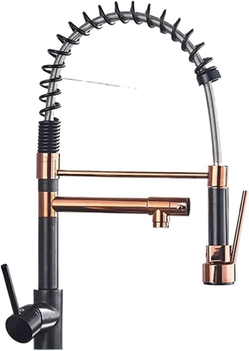 Bring contemporary elegance and functionality to your kitchen with this high-quality brass pull-down faucet. Measuring 48 cm in height and 22 cm in spout reach, it offers generous clearance and flexibility for everyday tasks like washing dishes or filling large pots. Made from premium solid brass, this faucet ensures exceptional durability, corrosion resistance, and long-lasting performance. The black and gold pink finish adds a luxurious, modern touch that complements a wide range of kitchen styles. Its spring pull-down design provides effortless maneuverability and extended reach, while the single-lever handle allows smooth control of both water temperature and flow.