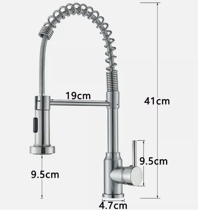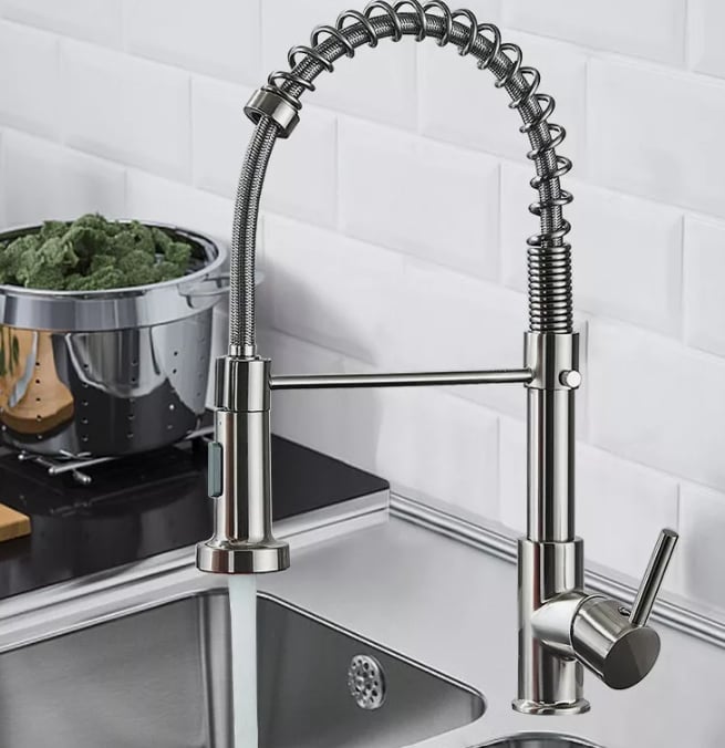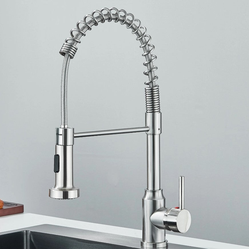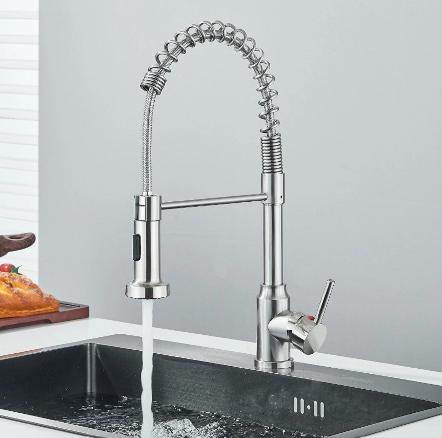 This modern professional-style kitchen faucet combines functionality, durability, and contemporary design. Inspired by commercial kitchens, it offers excellent flexibility and precise water control, making everyday kitchen tasks easier and more efficient.The high-arc spring spout provides a wide working area, while the pull-down spray head allows for effortless rinsing, cleaning, and filling of large pots. Finished in brushed nickel, this faucet fits perfectly into both modern and industrial-style kitchens.Designed for long-lasting performance and user comfort, it is an ideal choice for anyone looking to upgrade their kitchen with a practical yet stylish solution.