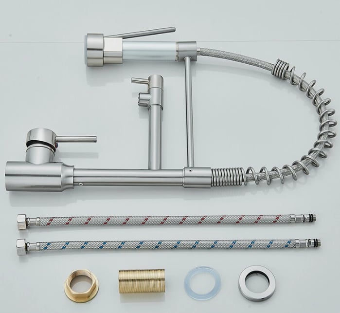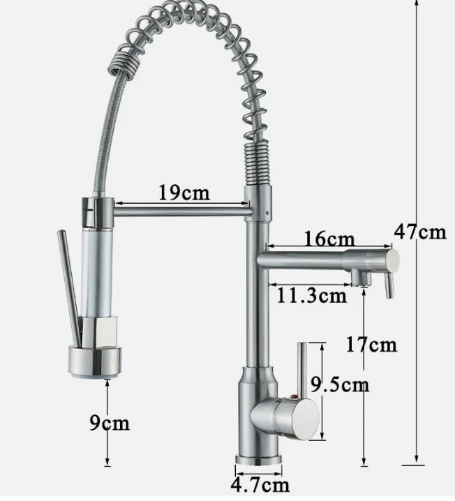 This professional-style kitchen mixer tap is designed to deliver maximum performance, flexibility, and modern aesthetics. Featuring a high-arc spring spout and a pull-down spray head, it provides excellent reach and control, making everyday kitchen tasks faster and easier.The dual spray function allows you to switch effortlessly between a steady stream and a powerful spray, ideal for rinsing dishes, cleaning the sink, or filling large pots. Finished in elegant brushed nickel, the tap offers a contemporary look while resisting fingerprints and water stains.Built with a durable ceramic cartridge and supplied with standard G 1/2" female flexible hose pipes, this tap ensures smooth operation, reliable performance, and easy installation in most kitchen setups.