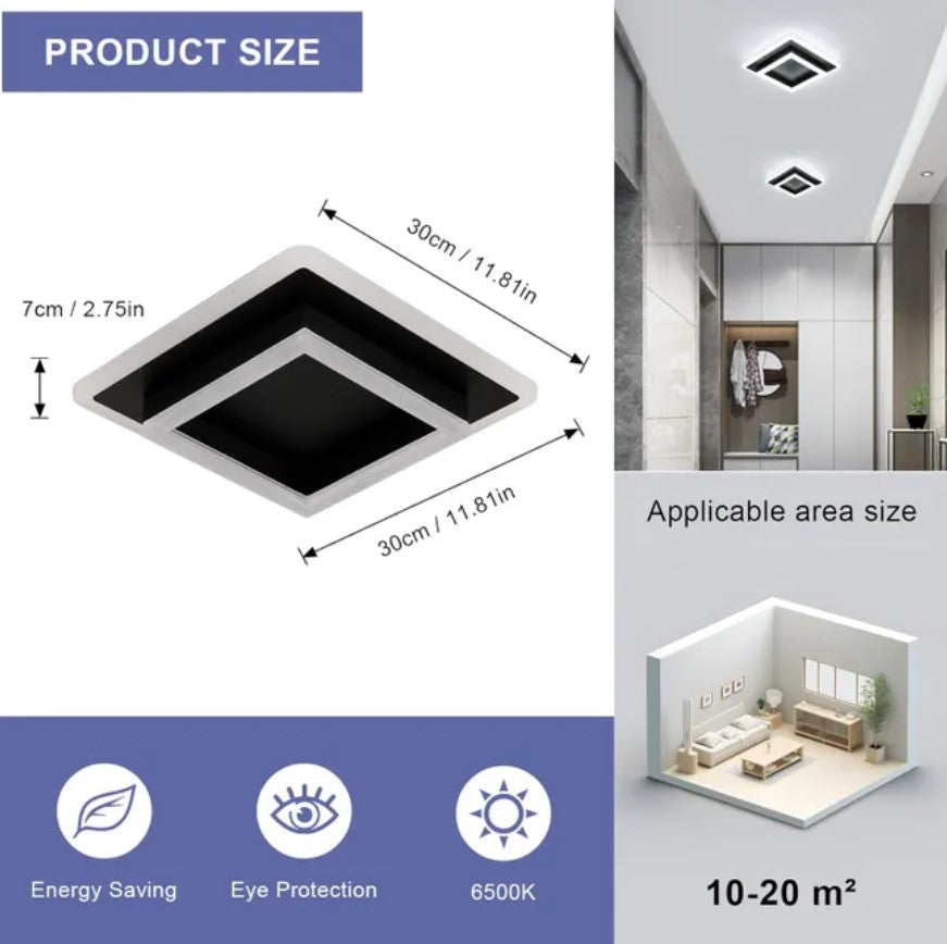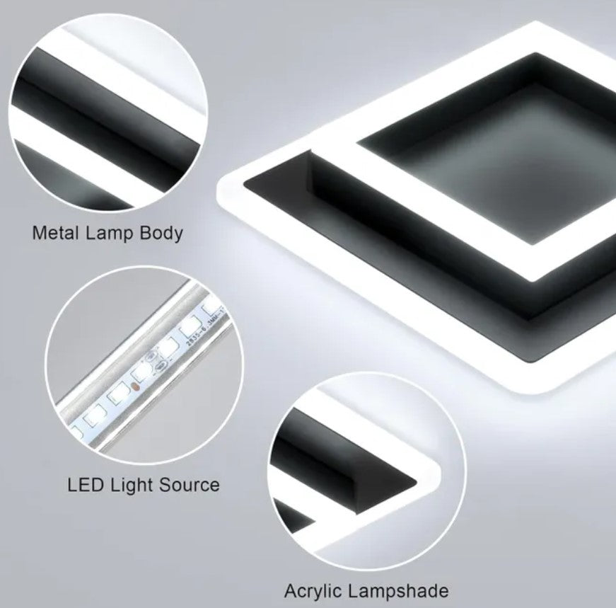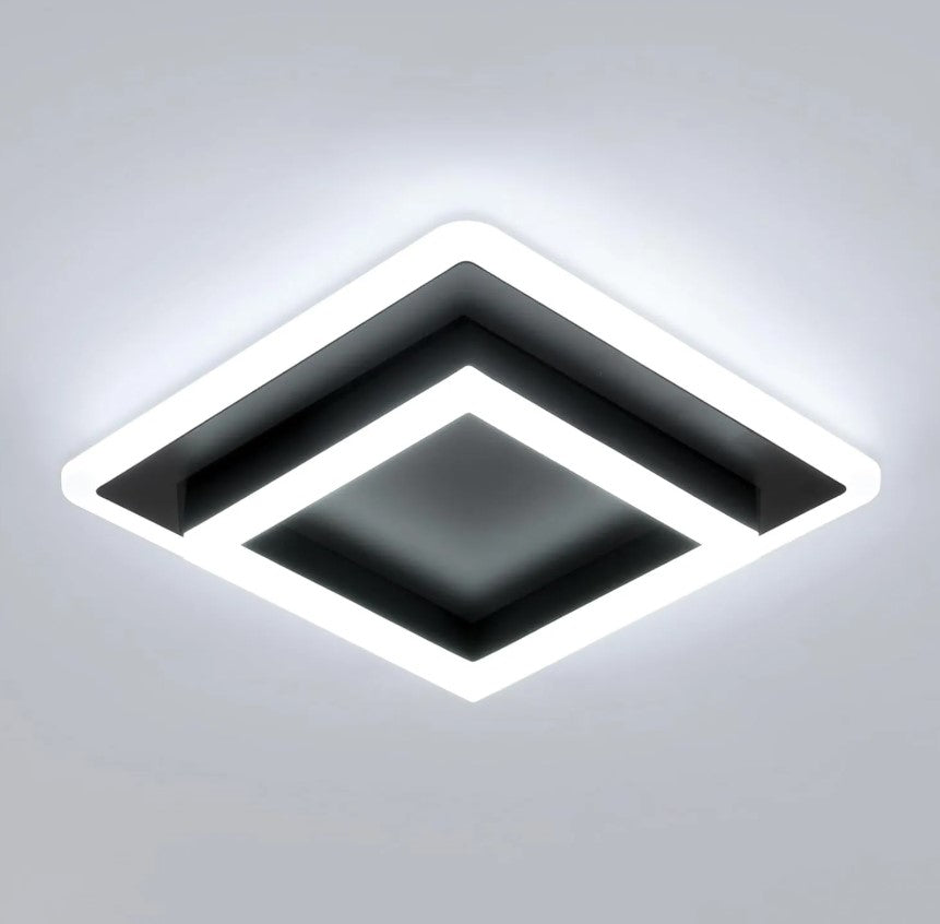 This modern square LED ceiling light features a sleek matte black panel combined with a translucent acrylic border that softly diffuses light around the perimeter. The contrast between light and dark enhances depth while maintaining a clean, minimalist aesthetic. Designed with precise lines and a low-profile form, this ceiling light adds a contemporary touch to any interior space.