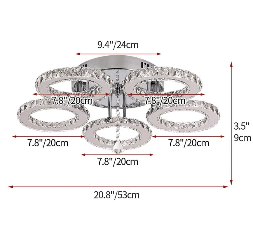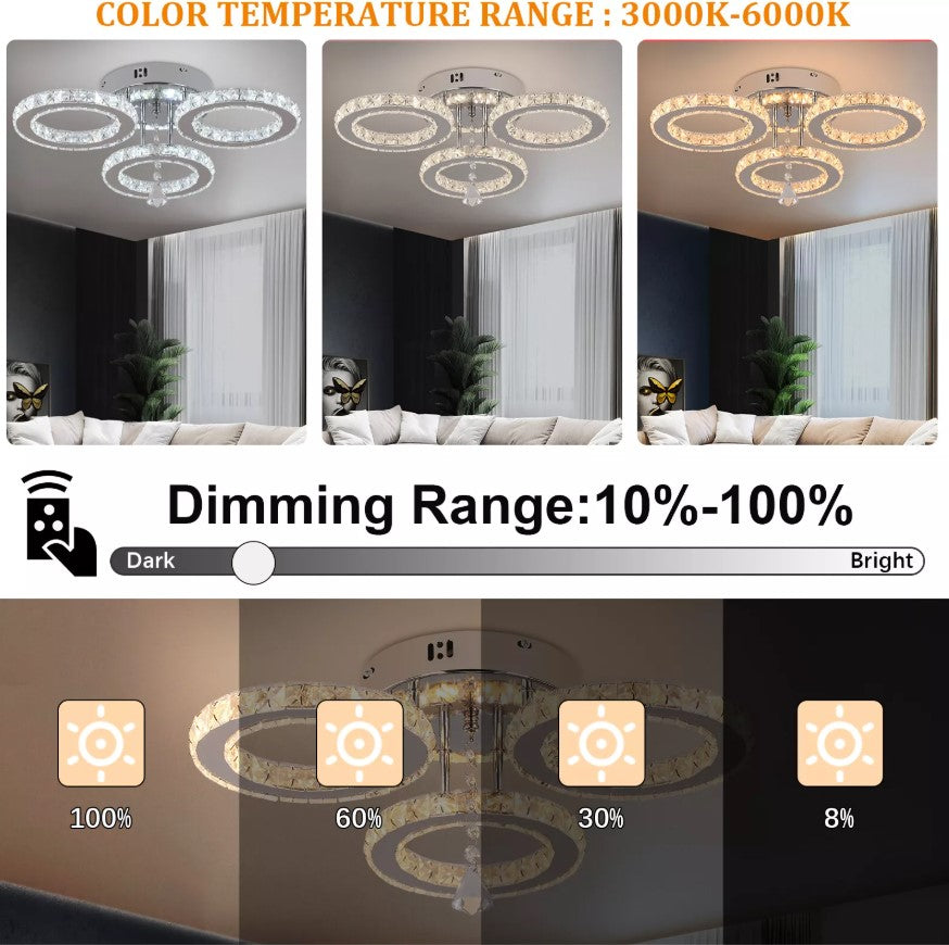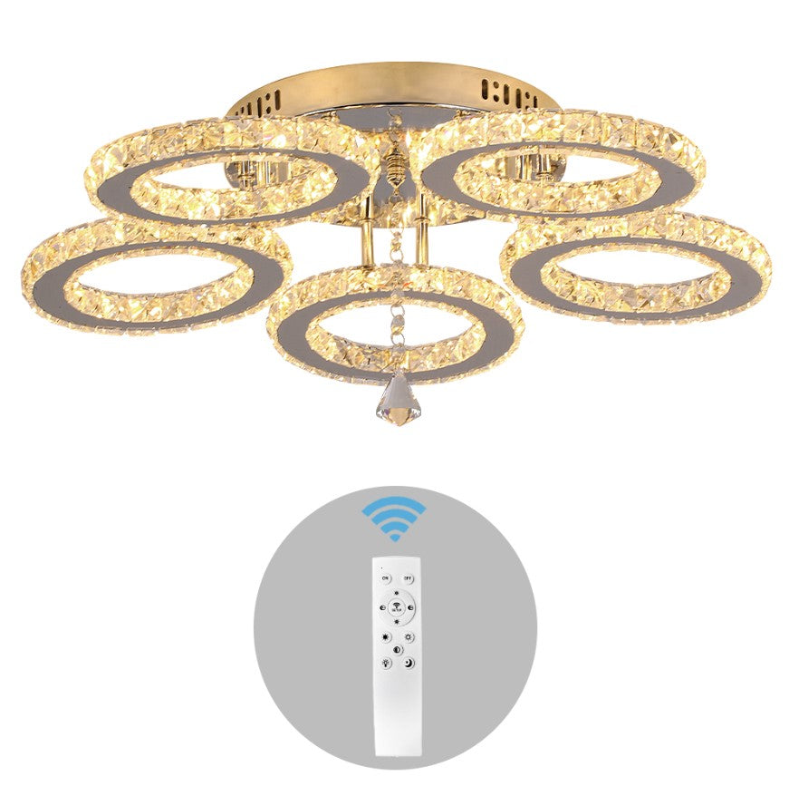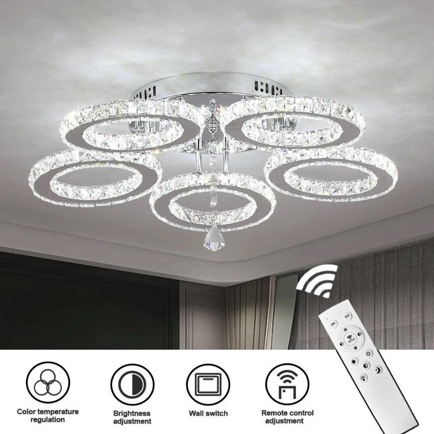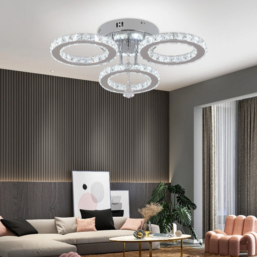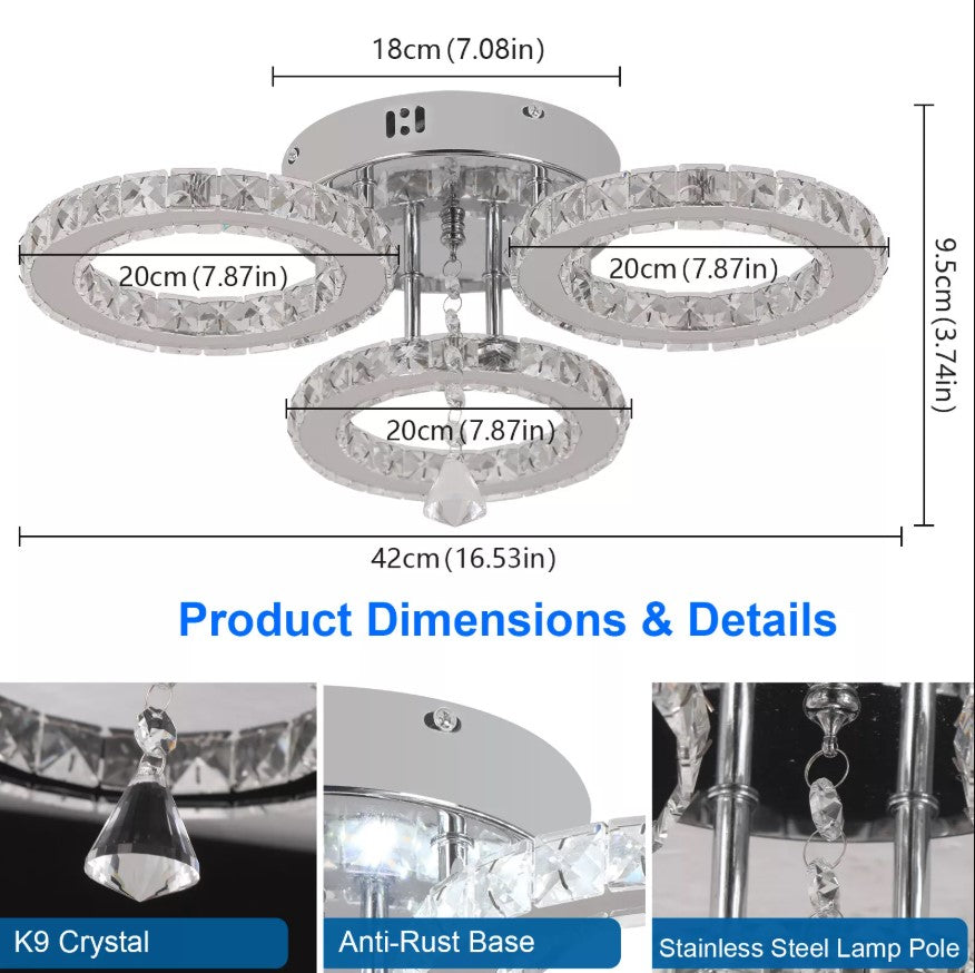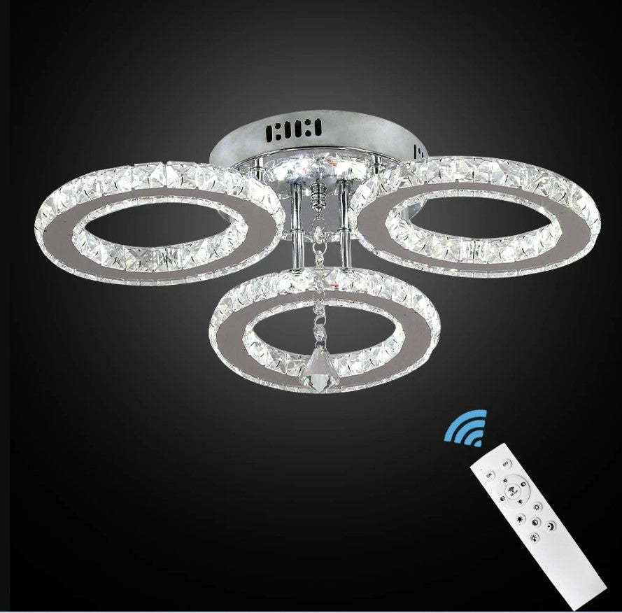 Upgrade your interior with this modern LED crystal ceiling light, designed to combine elegance, functionality, and contemporary style. Featuring multiple illuminated crystal rings, this fixture creates a luxurious visual effect while delivering bright, evenly distributed lighting. The premium K9 crystal enhances light refraction, adding sparkle and sophistication to any room. Equipped with a remote control, the light allows effortless adjustment of brightness and lighting modes to suit different moods and occasions. Its compact, low-profile design makes it ideal for living rooms, bedrooms, dining areas, and hallways, especially in spaces with lower ceilings. Built with durable stainless steel and an anti-rust base, this ceiling light offers long-lasting performance and modern appeal.