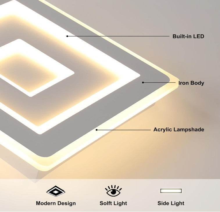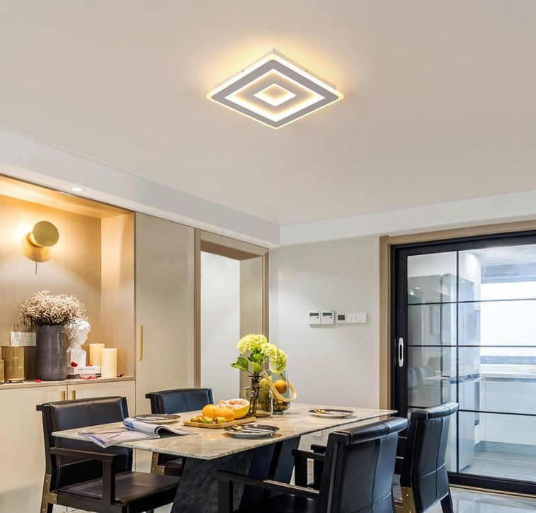The LED ceiling light is made of metal and acrylic, high temperature fire paint, corrosion and rust protection, acrylic lampshade, uniform light transmission, soft light, glare-free. The modern square LED ceiling light has a geometric square shape, decorates your room and illuminates at the same time. Built-in LED lamp beads with high brightness, which save more energy than incandescent light.