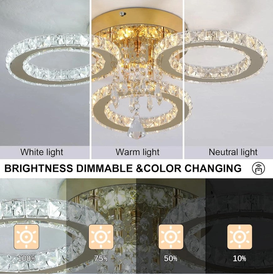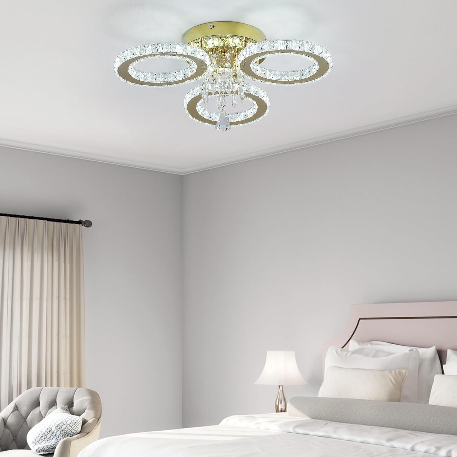 Simple and elegant design. Measuring 44 × 22cm, this modern chandelier features 3 elegant crystal rings mounted on a gold-tone stainless steel base. With its low-profile flush mount design, it fits seamlessly into modern interiors, adding visual interest without overwhelming the space. Constructed from high-transparency K9 crystal and polished stainless steel, this LED ceiling light offers lasting performance and timeless appeal. The precision-cut crystals boast a high refractive index, enhancing light dispersion and creating a radiant, eye-catching glow that elevates any room. This elegant chandelier features 3 crystal rings (each 19 cm in diameter), offering a modern and cohesive look. Best suited for medium-sized spaces such as bedrooms, dining rooms, hallways, entryways, or compact living rooms—an excellent fit for homes with standard or low ceilings.