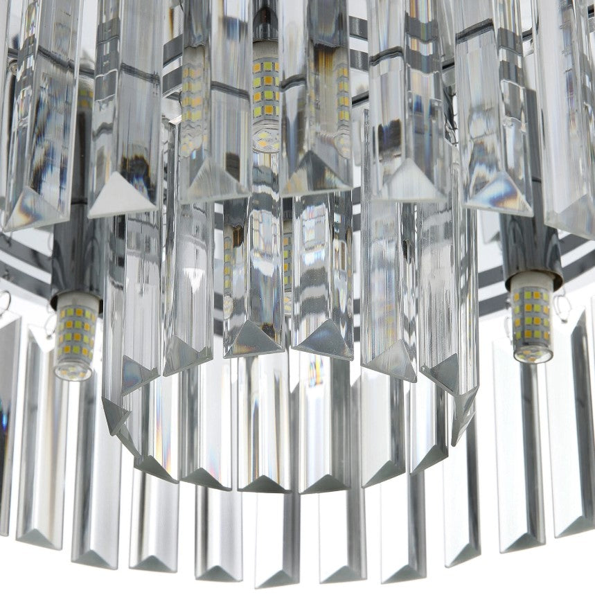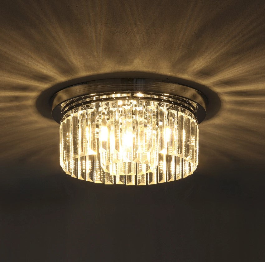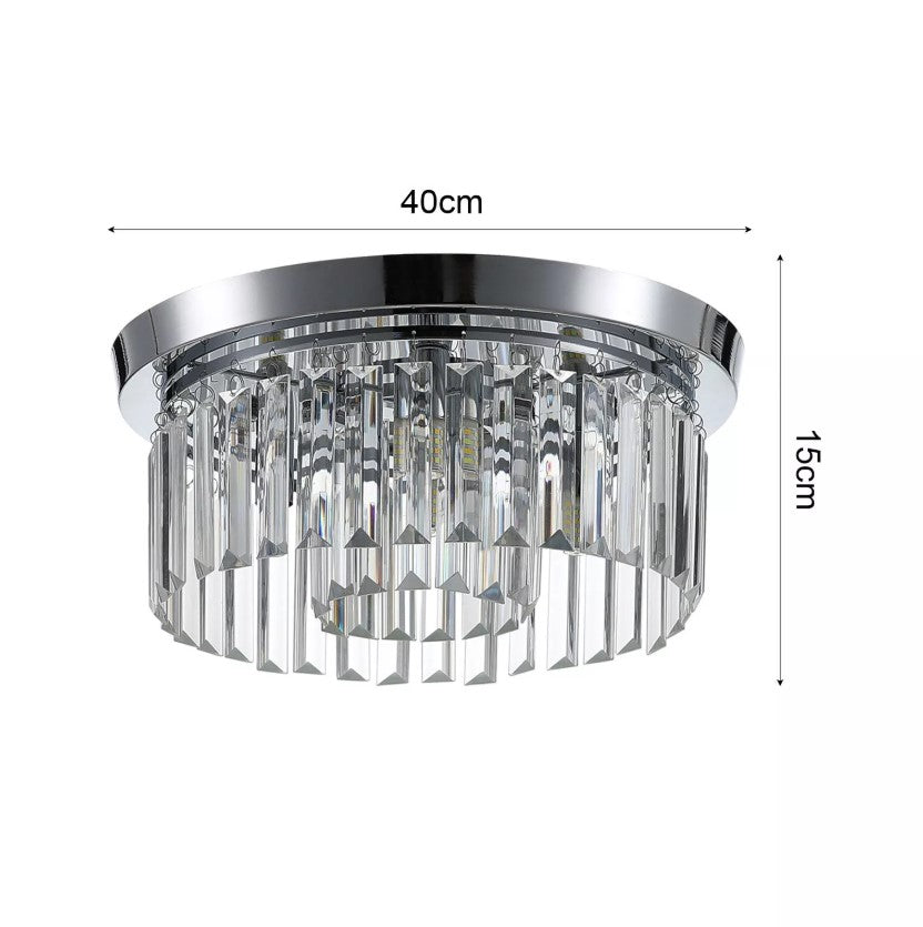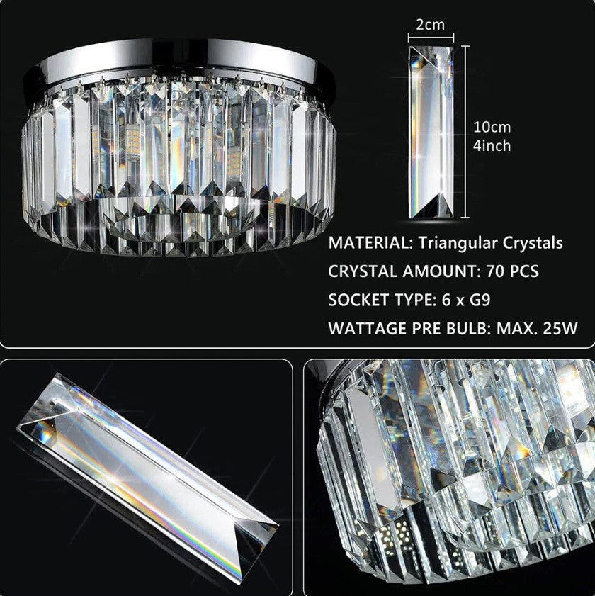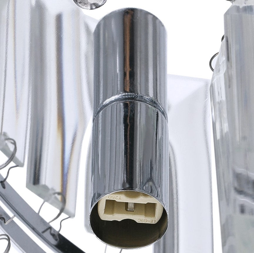 This elegant ceiling light features premium rectangular crystals arranged in a stunning two-ring design, beautifully reflecting light against a chrome-finished metal base. Its modern and luxurious style creates a warm and inviting atmosphere in any space. Designed with 4 G9 bulb sockets, it is compatible with LED, halogen, incandescent, and CFL bulbs (bulbs not included, max 40W).