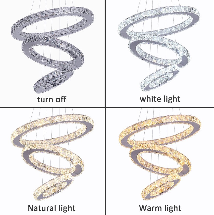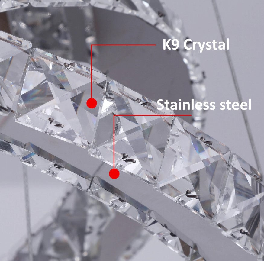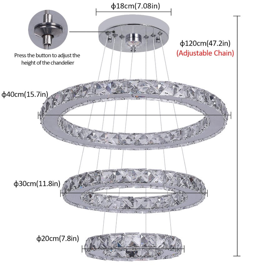 This elegant K9 crystal chandelier features precision laser-cut crystals with sharp, refined edges that create a stunning visual effect through light refraction, making it a perfect addition to modern interiors. Designed with three adjustable rings (20 cm, 30 cm, and 40 cm in diameter), the chandelier allows for creative DIY arrangements, enabling you to customize its shape to match your personal style. It is ideal for dining rooms, living rooms, bedrooms, staircases, foyers, hotels, offices, and other contemporary spaces. Crafted with excellent quality and supported by reliable after-sales service, this chandelier delivers both beauty and durability.