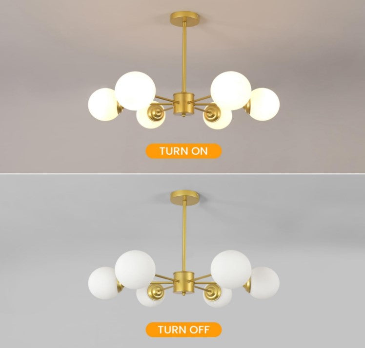 Glass Ball Chandelier Light Fixture brightens up your house with a chic look and luxurious vibe. Perfect for living room, kitchen island, dining room, bedroom, kitchen, farmhouse, foyers, hallway, and any space you like. Modern Sputnik Chandelier uses a white spherical glass lampshade to complement the golden lamp body. Emitting a modern and elegant atmosphere. It is very suitable for medieval, retro or rural style chandeliers.