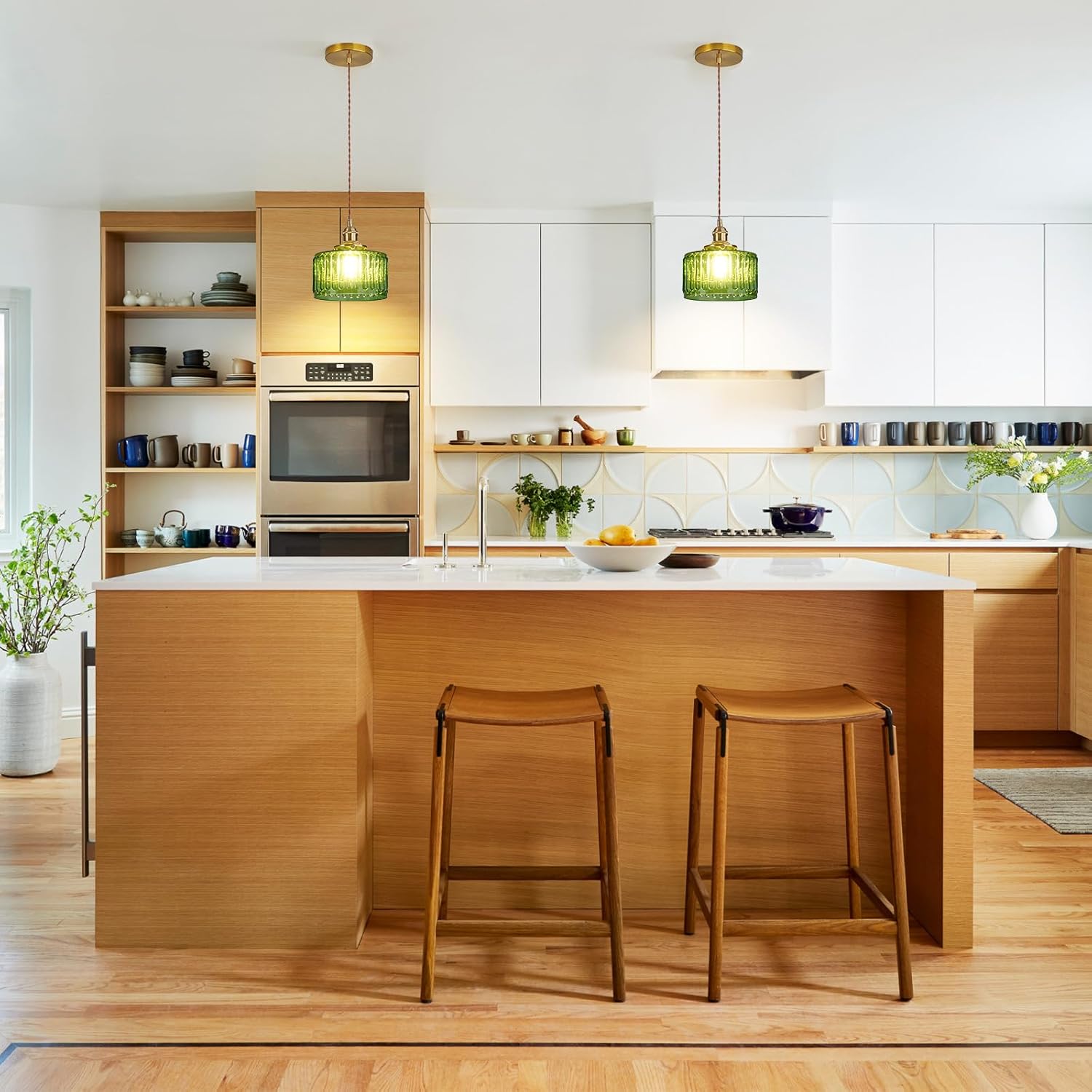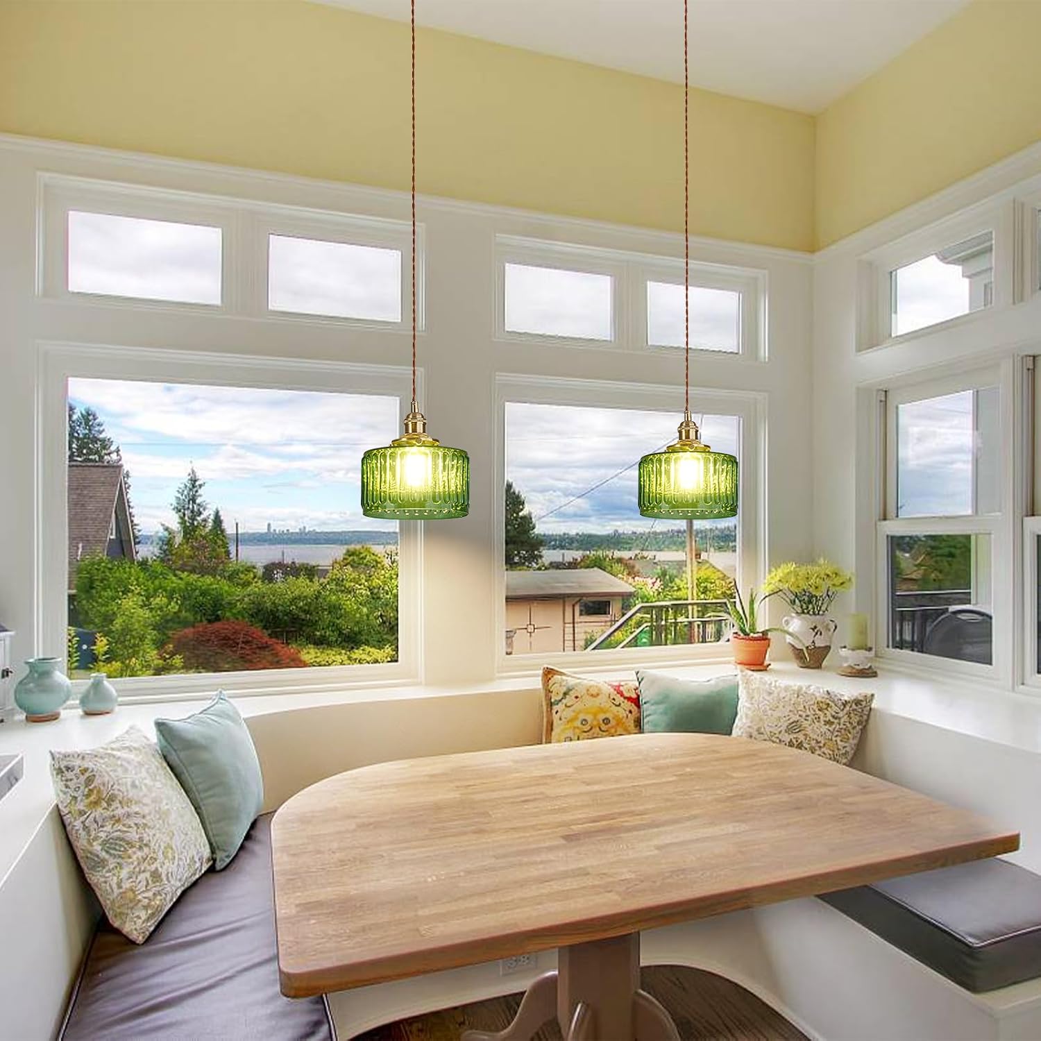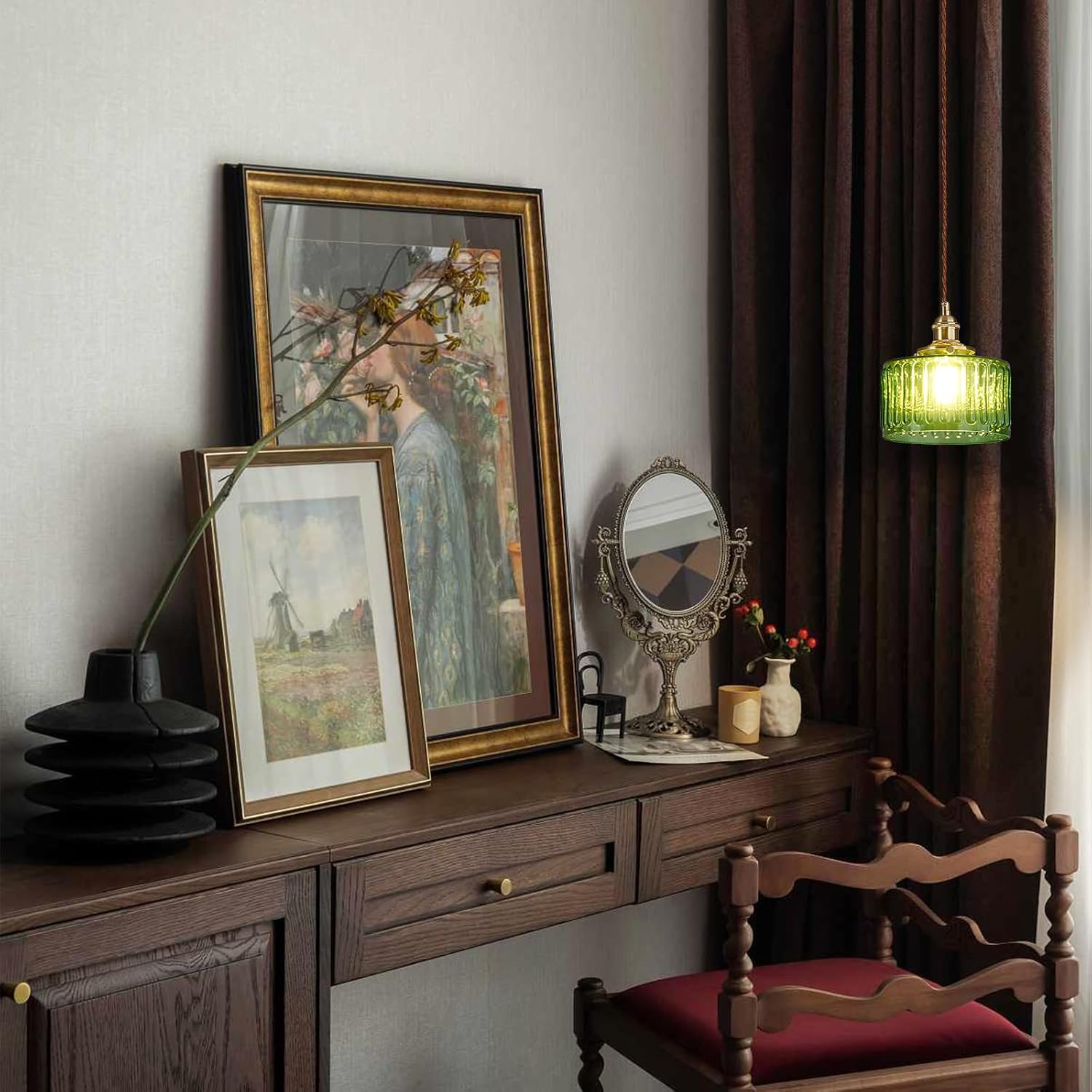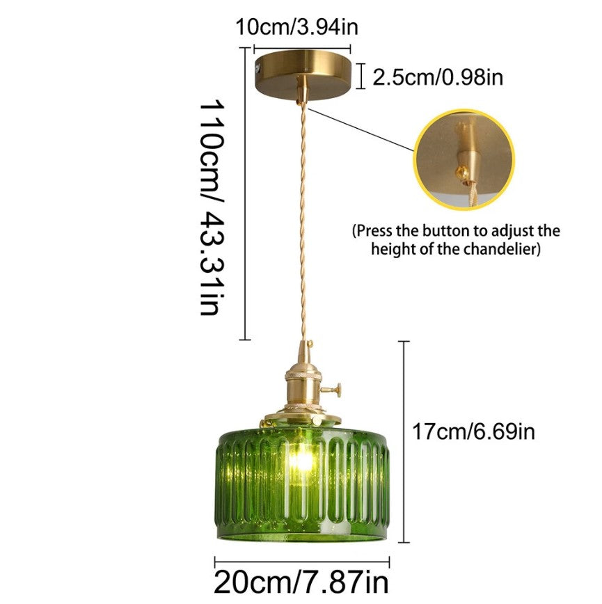 Add a touch of vintage elegance and modern charm to your interior with this stylish green glass pendant light. Featuring a beautifully ribbed glass shade and a warm brass-colored ceiling plate, this hanging lamp creates a cozy and inviting atmosphere in any space. The adjustable cord allows you to easily customize the hanging height, making it perfect for kitchens, dining areas, bedrooms, cafés, or bars.